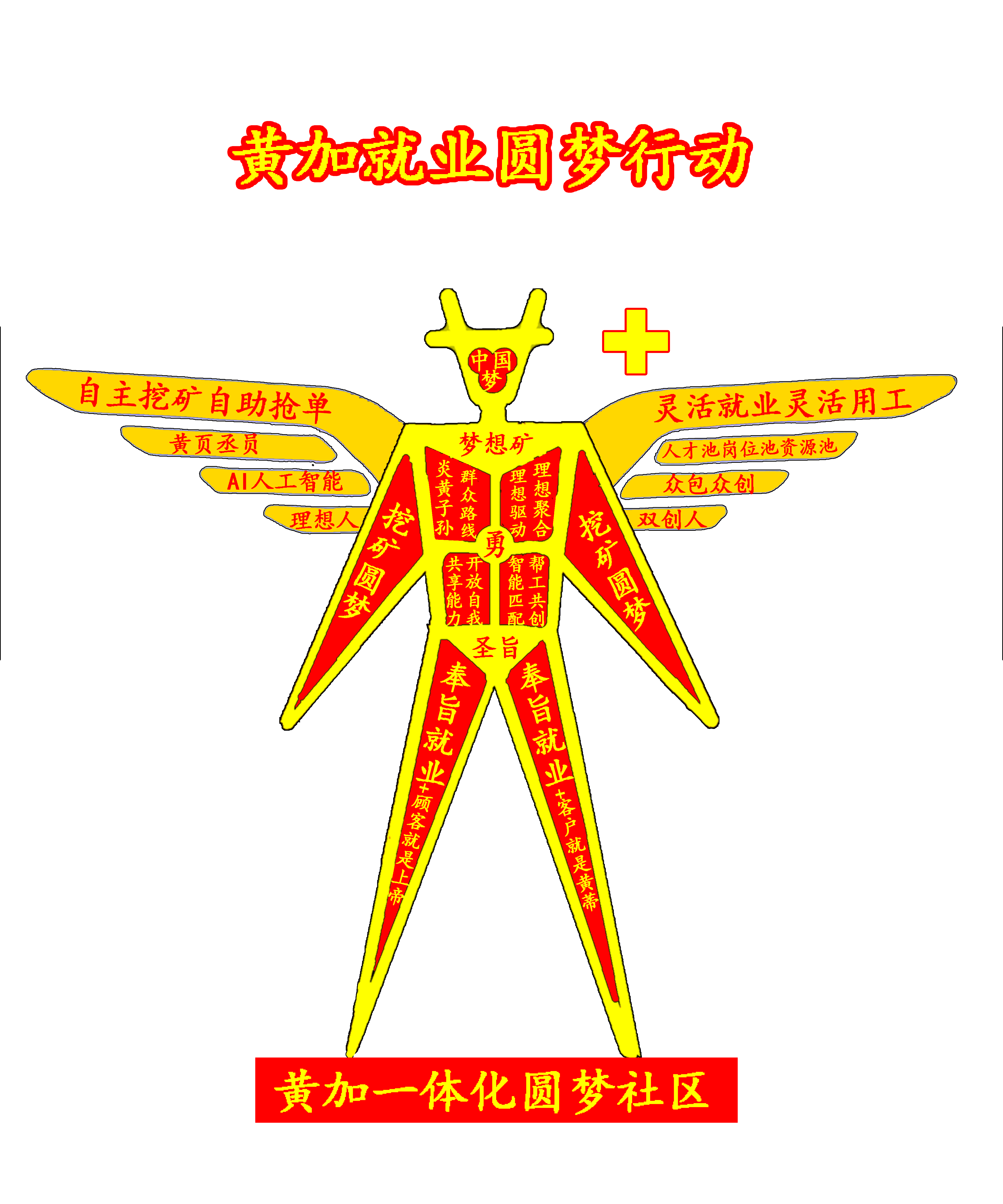 黄加社区经过长期经验探索,结合《中国梦》《大众创业+万众创新》《15分钟社区生活圈》《平台经济》《数字经济》《全国统一大巿场》等政策风口和《人文始祖轩辕黄帝文化》《民族文化基因是中国梦的魂与根》等新国潮文化,理论联系实际,实践探索出一种低门槛高效率的黄加一体化圆梦社区的理想解决方案:黄加黄脉黄享黄创圆梦理想解决方案(别称:黄加社区外卖AI双模式全行业衍生重构),并总结成下面的四言诗进行曲;